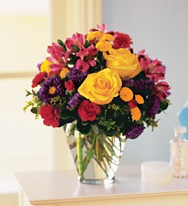 They brighten your day, every day. so, let them know how much it means to you with this colorful assortment of cheerful blooms, thoughtfully arranged in a softly rounded vase. roses, alstroemeria, asters, carnations and chrysanthemums are delivered in a cheerful clear glass vase. approximately 12"w x 13"h