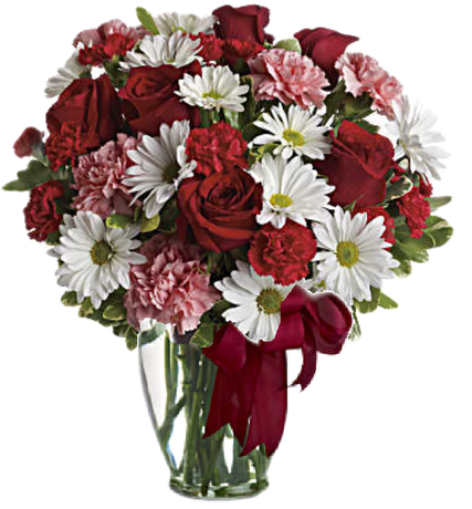 Whether for your significant other or your sister, aunt or grandmother, this delightful floral gift is a sweet way to say "i love you." sweet price, too. the charming bouquet includes white daisy spray chrysanthemums, pink carnations, red miniature carnations and red roses accented with fresh greenery. delivered in a stylish red vase. approximately 12 1/2" w x 15" h