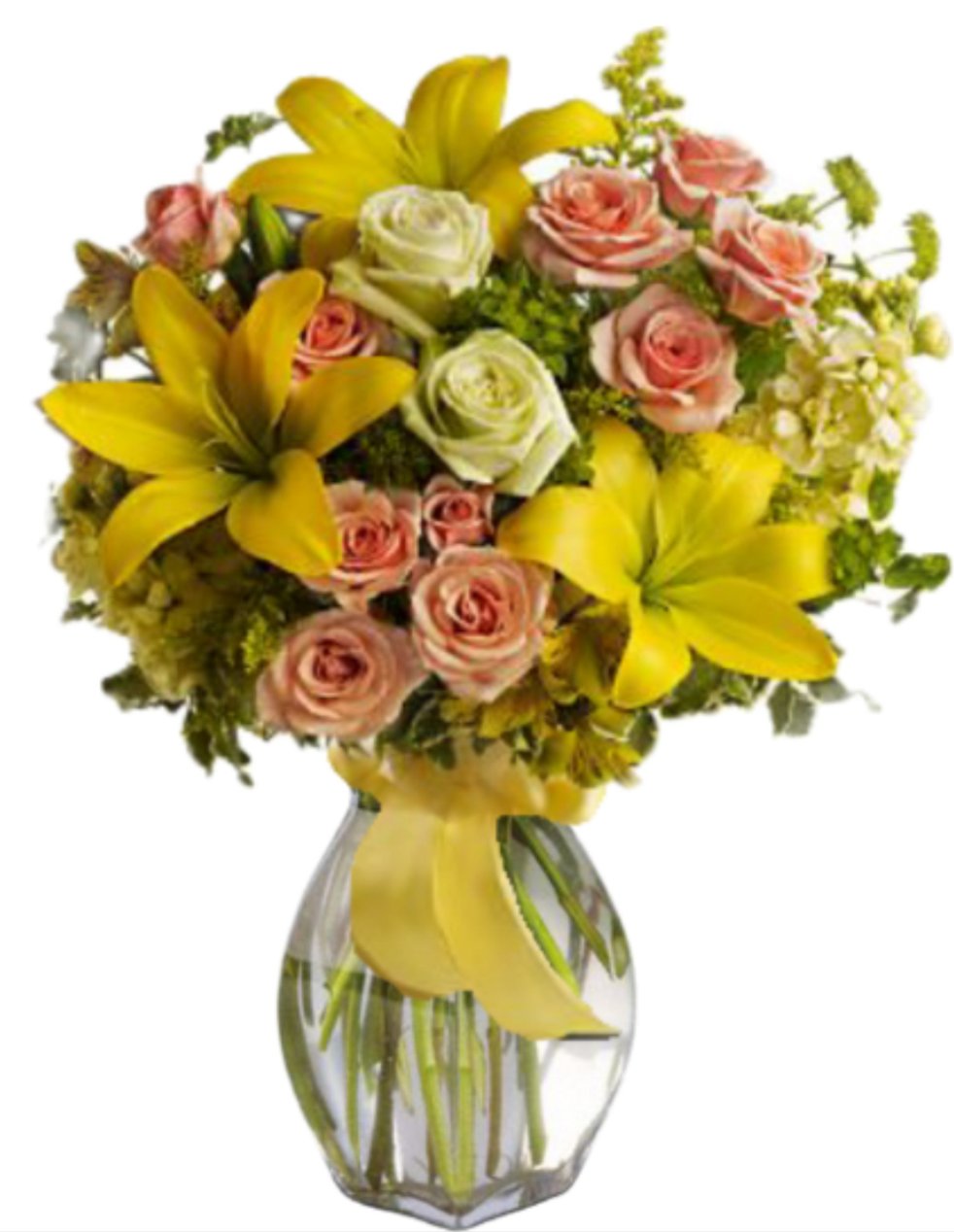 If smiles were flowers, they'd look just like this. a cheery bouquet of yellow, peach and white blossoms is like a vase full of happiness! add a matching yellow ribbon, and it becomes a bright day indeed. this lovely floral gift is an excellent "get well" choice, or just the right touch to perk up someone’s spirits.