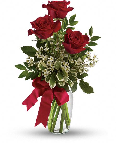No big deal. just a beautiful deal. this gorgeous trio of red roses accented with lush greenery in a sparkling vase is so surprisingly affordable that you may want to send it to several special people. a sweet, simple expression of your love. this charming bouquet includes three red roses accented with white waxflower, huckleberry and pittosporum along with a red satin ribbon. delivered in a clear glass vase. approximately 10 1/2" w x 16 1/2" h